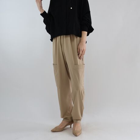 [型番:141426]ハイゲージの編地の張り感のある布帛ライクな素材シリーズ鈍い光沢感が大人っぽく、おしゃれな素材です。おしゃれなカーゴパンツ風です。