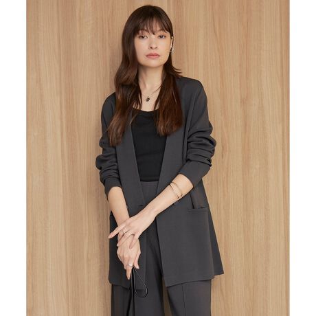 ■デザインミラノリブ編みで編みたてたノーカラーのダブル前ジャケットです。ドロップショルダーでゆったりとしたシルエットながら、釦位置をあえて下目にし程よい抜け感をプラス。バックの流線的な切り替えデザインもポイントです。同素材のワイドパンツやニットビスチェと合わせてセットアップでの着用もおすすめです。