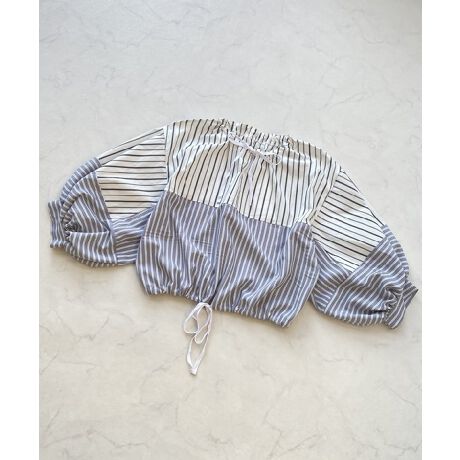 短丈と袖のボリュームシルエットがムードある1枚。ストライプ特有のナチュラルでマニッシュな雰囲気とボリューミーな女性らしいシルエットが相性バツグンなアイテム◎切替もスタイルアップを計算された位置で仕上げております。1枚着でももちろん前開き仕様なので羽織りもGOOD。首回りと裾にリボンがついているのでぎゅっと寄せてシルエットも作れます。