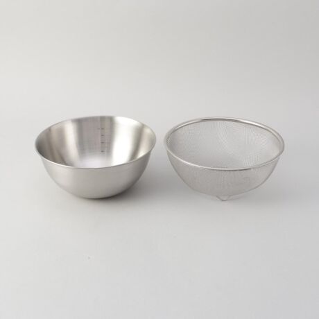 水切れの良いメッシュザルと計量できる目盛り付きボウルのセットです。