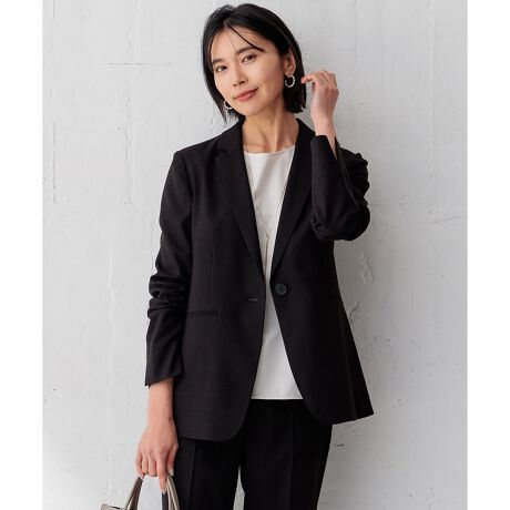 少し長め丈のテーラードジャケットは、シンプルなーつボタンにすることでマニッシュになりすぎず、単品ジャケットとしてもスタイリングの幅が広がります。同シリーズのパンツやスカートとの着合わせでセットアップにも対応できます。単品でボトムスをカジュアルにしても着られる着回し抜群ジャケットです。袖口は重ねスリットをあしらい折り返し可能です。素材の軽さもあるので、前を開けて肩にかけてさらっと着こなすのもおすすめです。カラーは、女性らしく清潔感溢れるベージュ(#033)、大人上品なネイビー(#075)、どんなシーンにもお使いいただけるブラック(#005)の3色展開です。