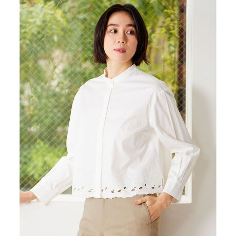 コーディネートの華となる裾刺繍ブラウス■デザイントレンドのクロップド丈のレースブラウスです。前後の裾にボタニカルレーススカート(SKW7CM0316)のレースモチーフを元にオリジナル柄の刺繍を施し、スカラップ仕様のシンプルなデザインでありながらも華やかさを感じる1着です。釦を閉じても、羽織りとしても着て頂けるので春夏のコーディネートに活躍します。着丈に前後差があるので、クロップド丈でありながらも気になる腰回りをややカバーできます。ワイドパンツやスカートなどボリュームのあるボトムと相性が良く、特にテンセルツイルカーゴパンツ(PRW7CM0315)とのコーディネートが今年らしくておすすめです。■素材細番手の綺麗な綿糸を高密度に織り上げたツイル素材です。繊細なツイル組織にすることで、しなやかさと程よい光沢感があり、ナチュラルな素材でありながらも上品なシャツ地に仕上がりました。