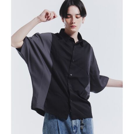 ゆったりとしたサイジングと脇下の大きく広く開いたドルマンシルエットが特徴のシャツ。