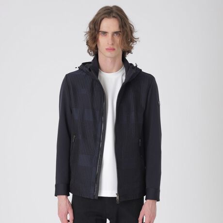 前身頃とフード部分にシアサッカー組織シャドーチェック素材、後ろ身頃と袖部分に軽量ベアダンボールニット素材を組み合わせた、異素材コンビデザインパーカー。フード取り外しが可能な2WAY仕様で、スタンドブルゾンとしても着用が可能です。