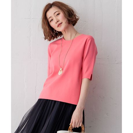 スッキリとしたサイジングで重ね着も美しい、五分袖ニット
