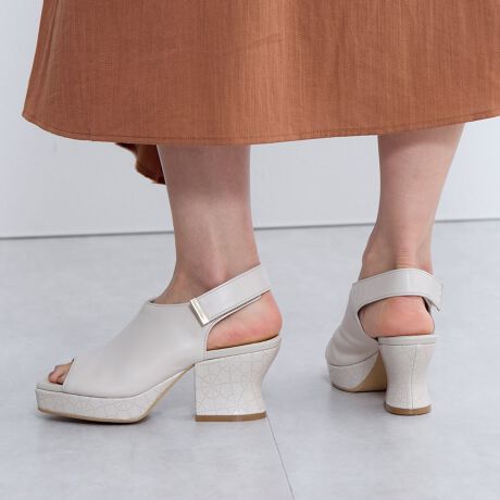かかと部分は面テープ仕様で脱ぎ履きしやすく仕上げました。ヒールを7cm、ストームを2cmでデザインすることで、歩きやすく疲れにくい傾斜に。