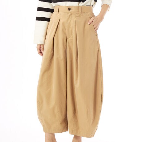フラボアで人気のウォークパンツがカラーをリニューアルして再登場。大胆にとったタックと裾に立体的に入ったダーツでワイドながら綺麗なスッキリ目のシルエットはそのままに、さらに履き心地を追求して微調整されたパターンになっています。ウエストのゴムとヒモでイージーな仕立てになっているなど、デザイン性がありながらもデイリーに履きやすいアイテムになっています。