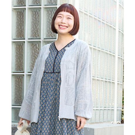 柄をミックスした透かし編みのジップアップカーディガンです。