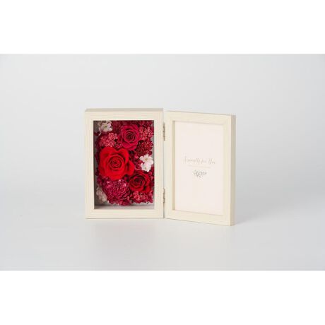 プリザーブドフラワーのアレンジメントと、フォトフレームが一体に。
