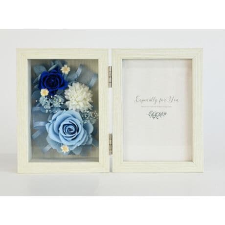 プリザーブドフラワーのアレンジメントと、フォトフレームが一体に。