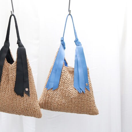 ペーパーと少し光沢感のあるポリエステル糸を引き揃えて編んだ1本手のかごトートバッグ。