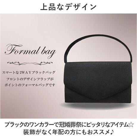 シンプルでどのフォーマルシーンにもピッタリ☆2WAYフォーマルバッグが発売♪【クラッチバッグとして】フラップ上部裏側のスナップボタンで持ち手が取り外せる仕組み。シーンやコーデに合わせてスタイルのチョイスが可能♪【上品なデザイン】ブラックのワンカラーで冠婚葬祭にピッタリなアイテム☆装飾がなく年配の方にもおススメ♪【開け閉めラクラク】フラップはマグネット仕様になっており開け閉めが楽チン!忙しい時もすぐに小物が取り出せる仕様に。【マストなアイテムの収納に】お財布・スマートフォン・リップクリーム・ミラー等の必要なアイテムが収納可能。【小物を分けて収納】バッグの内側には、小物の整理に便利なオープンポケット×1、ファスナーポケット×1を配置。【嬉しい軽量素材】片手でもラクラク持ち上げられる軽さ!小物をたくさん入れても持ち運びしやすい。【様々なフォーマルシーンに】冠婚葬祭などの行事やパーティ、授業参観や入学式など、フォーマルシーンを落ち着いた雰囲気に演出してくれる優秀バッグ。【ポケット仕様】メインルーム・・・オープンポケット×1、ファスナーポケット×1