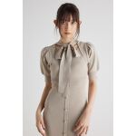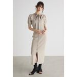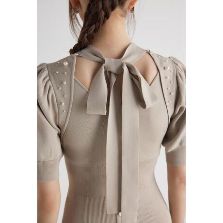 【上品なフェイクパールが今っぽい着回し力抜群のレディーなニットワンピ】【Design】フェクパールが華やかさを引き立てるニットワンピース。フェイクパールは顔回りにたっぷりつけることで、大人にマッチする繊細なリッチ感を表現しました。前後を逆にしても着用できますし、リボンも前後ろにしても着用できるマルチシリーズなので、着回し力も抜群です。ハイウエストから切り替えがあり、程よいタイトシルエットなのでスタイルアップ効果も抜群です。ニットであることでリラックスして着用できるのも嬉しいポイントです。【Color】上品なWHT、ベーシックで大人なBEG、華やかなPUR、シックなBLKの4色展開です。■透け感:無し■光沢感:無し■伸縮性:あり■裏地:無し