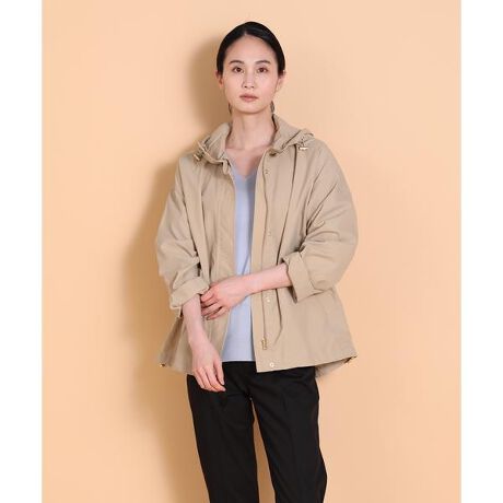 リラックスしたシルエットのフーデッドブルゾン。フードやドットボタン等、スポーティーなディテールをアクセントに、シンプルでスタイリングしやすい、ベーシックなデザインに仕上げました。袖口は自由に折り返しできる仕様になっています。ネック部分を覆うハイネックデザインは防風対策に、また優れた水切れ性とシワになりにくさを備え、機能性抜群の一着。軽くてドライな清涼感のある素材感で春のライトアウターにピッタリです。・裏地無し《ダントツ撥水™》ダントツ撥水™は 小松マテーレ(株)独自の技術により開発された加工です。撥水力と撥水力を維持できる耐久性において、とくに優れた機能を発揮します。抜群の水切れの良さを体感でき、日常生活においても撥水性能が低下しにくい素材です。