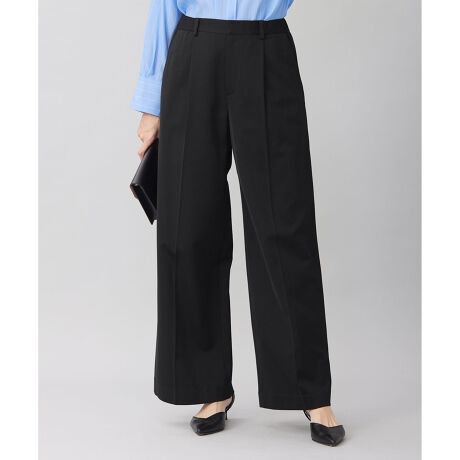 ジャージー素材で穿きやすいワイドパンツ■デザインウエストゴム入りの1タックワイドパンツです。太すぎない程よいワイドシルエットで、様々なトップスに合わせやすいデザインです。コンパクトなジャージーで仕立てているので、かっちりした素材にはない、程よい抜け感を感じられるパンツです。■素材綿とポリエステルの糸にシャリ感を持たせる追撚加工を施したオリジナルの糸で編立てたジャージー素材です。追撚することで、さらりとしたタッチの生地にでき、汗をかいても肌にまとわりつかず、適度な接触冷感を感じられます。ジャージーならではのストレッチ性はそのままに、伸長回復性に富んだ膝が抜けにくい生地に仕上げました。長時間のアクティブな動きに適し、肌離れの良さとイージーケアも加わって、春夏に快適に着て頂けます。