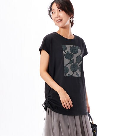フラワーモチーフのプリントがカジュアルながらも女性らしい印象に。オーバーサイズで、丈感はヒップをカバーしてくれる長さですが、ドローコード付きなので、お好みで長さに調節が可能です。また、快適な着心地を実現する吸湿速乾性に優れたMIX CLOTH素材を使用しているため、1日中さらっと着用いただけます。