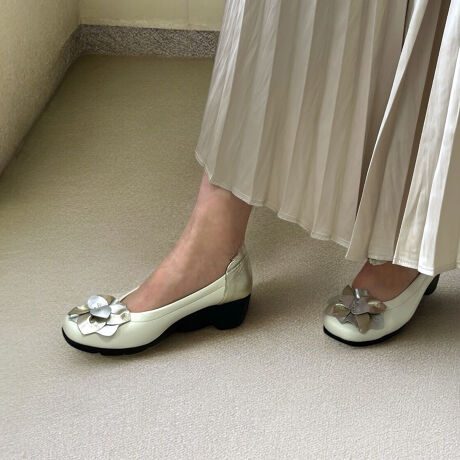 フラワーは同系色のコンビ革で優しい印象に。超軽量ソールは、程よい高さで安定感抜群。