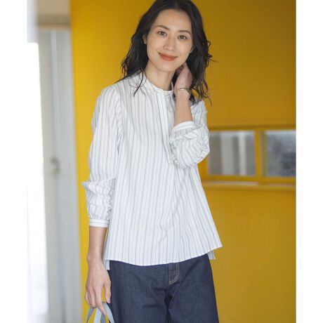 オンでもオフでも活躍する、シャツカラーブラウス。襟ぐり部分にギャザーを入れて柔らかな表情を出しています。前はヒヨク仕立てのため、すっきりとクリーンな印象に。サイドにスリットが入っているため、前裾のみボトムスにインしてもバランスよく着こなせます。シンプルなデザインながらきちんと感があり、上品に見えるアイテムで通勤ジャケットのインナーにもおすすめです。春先は1枚でさらっと、寒い時期にはニットとのレイヤードスタイルにも着回せます。カラーは、清潔感のあるシャープなホワイト(#101)、爽やかなサックスブルー(#173)の2色展開です。