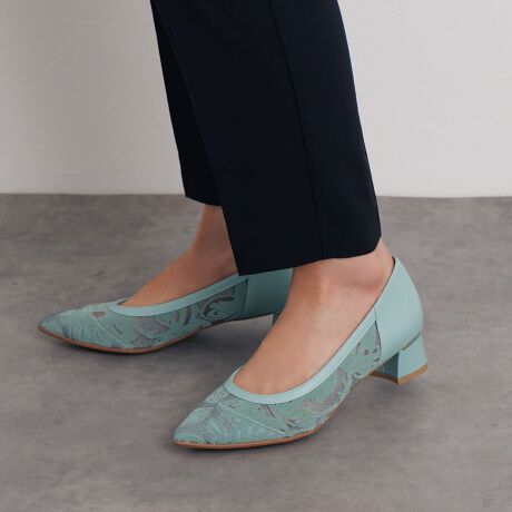 ラメと立体的にフロッキー加工されたチュールがさりげないシアー感でワンランク上の女性らしさを醸し出すパンプスに仕上げました。