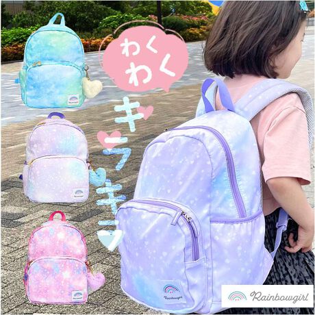 遠足に行くのが待ち遠しい!持っているだけでわくわくしちゃう♪”カワイイ”が大好きなお子様へおすすめのRainbowgirlの新製品 キッズリュック「Humming(ハミング)」パステルグラデーションのベースにハートや星の柄がついて、ゴールドのおしゃれなブランド引き手がキラリと光る大好きなハート型のふわふわチャームがついているので、目印にもバッチリ!ベーシックなデイパック型なので、遠足や休日のお出かけにもピッタリ。胸元にはDカンがついているので、防犯ブザーやキーホルダーなどの取り付けもOK!チェストベルトもついているので、肩からずり落ちを防止また、A4フラットファイルの角が曲がらずに入るサイズ。タブレットやノートPCを収納できる仕切りスペースもあるので、塾や習い事や学童にもおすすめのリュック