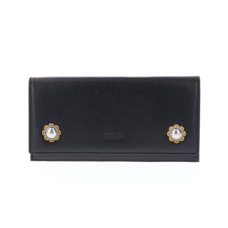 ヴィンテージ風のフラワーボタンがレトロかわいいお財布シリーズです。表にはソフトな革を、内装の裏地にはクラシックなロゴプリントの生地を使用しており、長くご愛用出来るデザインになっています。ブローチのデザインはビンテージのピアスから着想を得ており、メッキを部分的にアンティークゴールドとアンティークシルバーで染め分けているのもこだわりのひとつです。長財布は大容量のラウンドファスナータイプと薄マチタイプがあり、用途によって選ぶことが出来ます。他にも、定番の口金やパスケース、カードケースまで、ラインナップも豊富に取り揃えています。薄マチ長財布は、財布をスリム化したいけれど、長札タイプが良いという方におすすめです。小銭入れは外側背面についており、かさばりにくい構造となっています。【製品寸法】F : 縦:9.5, 横:19, 幅:2【素材】牛革【メーカーサイズ寸法(実寸)】F : よこ:19cm