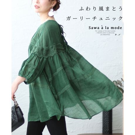 【チュニック】 トップス 緑 グリーン 7分袖 レース 刺繍 パフスリーブ 麻 リネン 無地 春服