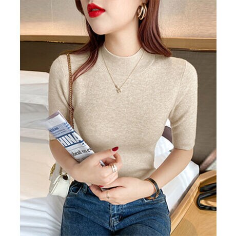 モックネック ニットトップス 五分袖韓国