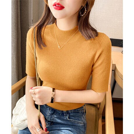 モックネック ニットトップス 五分袖韓国