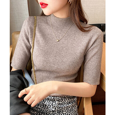 リブ編み仕様のプチハイネックは露出度が控えめ、ビジネスシーンでも使える