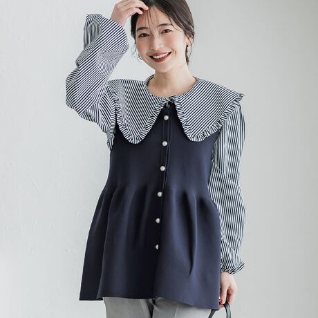 キレイめなブラウスとレイヤードすることでより上品で女性らしいスタイルを作り出します。