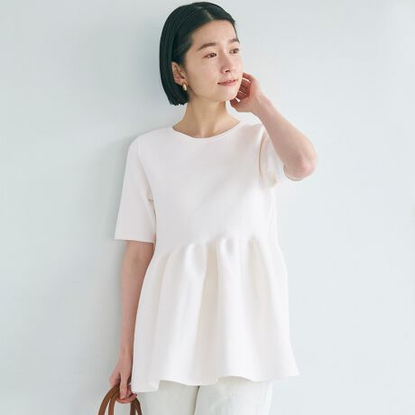 ウエストから広がるペプラムシルエットが女性らしい印象のトップス。