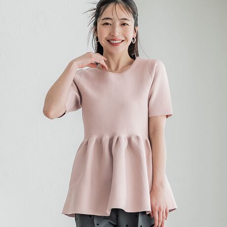 ウエストから広がるペプラムシルエットが女性らしい印象のトップス。
