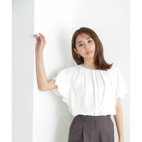 昨年も大人気だったバイカラーがポイントのフレアスリーブブラウスは、通勤シーンで程よい華やかさを演出。襟ぐりはメタルボタンをポイントにしつつ、比翼の内ボタンでシックな印象に仕上げました。ニュアンスのある配色部分はマットなサテンを使用し、さり気ない異素材感で高見えするデザインに。パンツはもちろん、スカート合わせで大人フェミニンなスタイリングにも活躍できます。<素材>白でも透けにくい、柔らかなジョーゼットを使用しています。<詳細>仕様・前ボタン裏地・なし透け感・ややあり / 光沢・なし / 伸縮性・ややあり 生地の厚さ・薄手※モデルの着用画像の場合、光の当たり具合により、実際の色味と異なって見えることがございます。色味は、商品単体の画像をご参照ください。