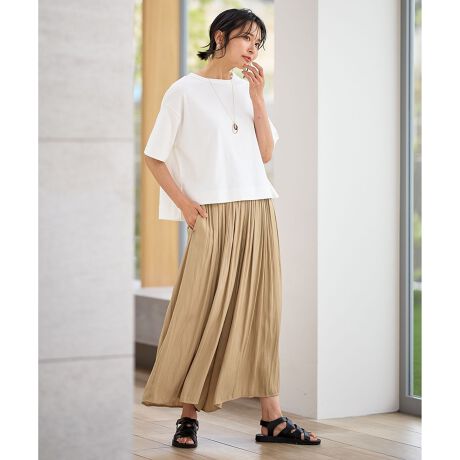 デザイン・生地をたっぷりと使うことでスカート見えするイージーパンツ・ボディラインを拾いにくいリラックス感のあるデザインながら、やや光沢感があるのできれい見えする・ワイドなシルエットとサラサラした素材感で肌への張り付きを少ない・ウエストゴムなので着心地抜群