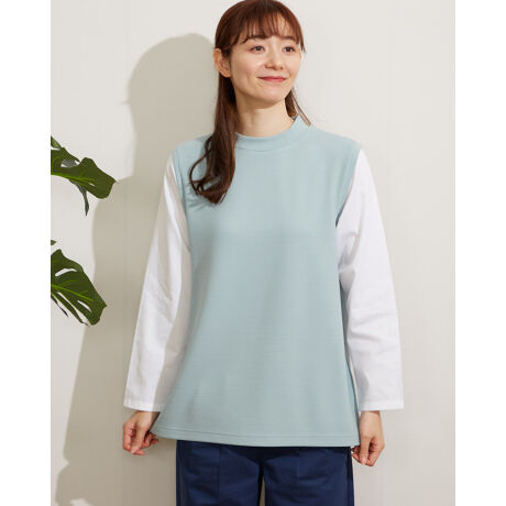 身頃のニット部分はポリエスレーヨンのジャカートで、袖の布帛部分は綿ピケの素材を使用しています。低いスタンドカラーでシャツにベストを重ね着した様に見えるのがポイントです。