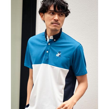 大胆にパーツで切り替えたトラッドなポロシャツです。脇部分を濃色で切り替えているので、お腹周りをスッキリみせてくれます。UV加工を施した、吸水速乾性に優れた生地を使用しているため、夏のゴルフやお出掛けに最適です!