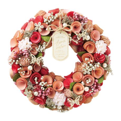 まるで本物の植物のような仕上がり。空間のアクセントになる「ナチュラルリース」Lサイズが新登場。【幸運を祈る、まあるいリース】お花や葉っぱなどで作られるリース。終わりのない形は「幸運がいつまでも続くように」という願いが♪【空間がパッと華やぐデザイン】天然素材を使い、自然な風合いを生かしたデザイン。色味も可愛らしく、飾るだけで存在感ばっちりな大きめサイズ。(※天然素材を使用しているため、サイズや形状、色合いなどにバラつきが出る場合がございます。)【サッと壁掛けできて便利】背面の紐を使ってフックなどに掛けるだけ。真っ白な壁に彩りをプラス。【お祝いのギフトにもおすすめ】中身が見えるクラフトボックス入り。英字新聞風の緩衝材もおしゃれで、ギフトにもぴったり。【自宅に飾って気分も晴れやかに】ドアや玄関に飾って幸せを呼ぶアイテム。あなたと大切な人の元に、たくさんの幸せがやってきますように☆