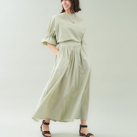 昨年も人気だった素材のスカートがブラッシュアップして登場。さらっと涼しいギャザーロングスカートは、ウェスト後ろゴム仕様で履き心地楽ちん。更にウェスト調節できる紐が背中側にあり、フロントはスッキリキレイ見えでインが綺麗に決まります。