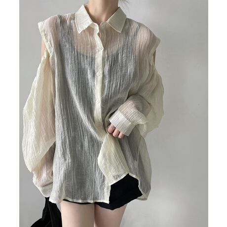 肩紐リボンゆったり前あきシアーシャツ 韓国ファッション
