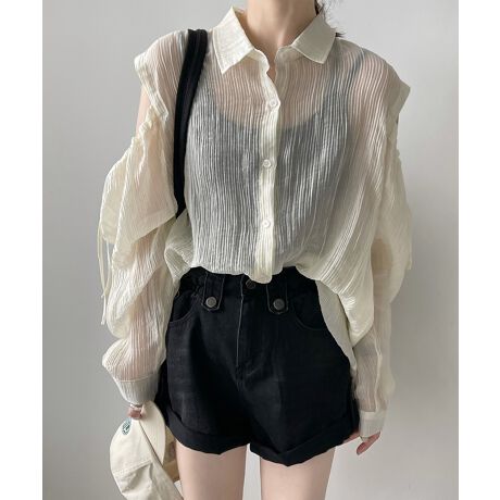 肩紐リボンゆったり前あきシアーシャツ 韓国ファッション