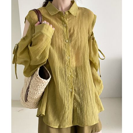 肩紐リボンゆったり前あきシアーシャツ 韓国ファッション