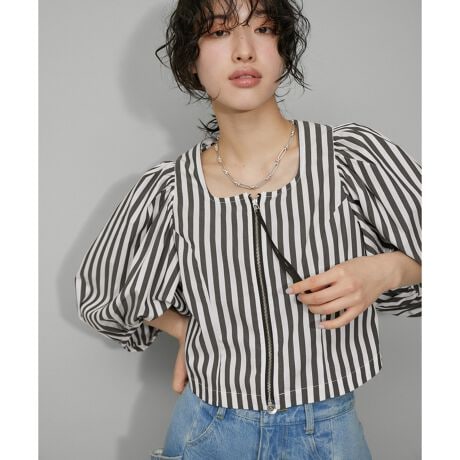 たっぷりとしたボリュームスリーブが華やかなクロップド丈のブラウス。ネックレスの映えるスクエアネックや、フロントジップがポイント。