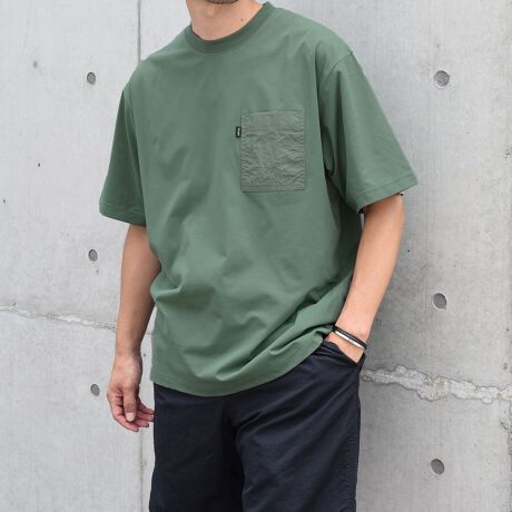 左胸にリップストップナイロン素材をポケットにしたアクセントのあるTシャツ。