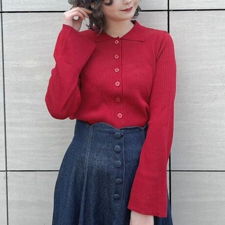 すっきりとしたシルエットなのでフレアースカートやパンツなど幅広いボトムに合わせやすい一品です。