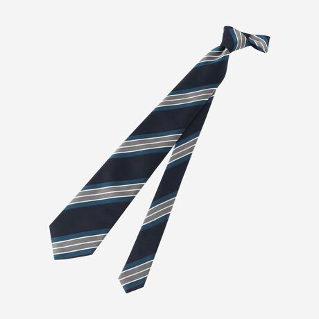 山梨県の機屋さんで織られた囲みストライプです。裏繻子の地組織にサテンのストライプを合わせた柄表現で、シルクの光沢感が効果的に出ています。ベーシックながらひねりの効いた配色で、襟元にインパクトを与えます。ウールの芯地でシワからの復元力を与えつつ、コットン/ポリエステルの補助芯でハリを持たせています。裏地は、ブランドアイコンのアンドリューパターンです。