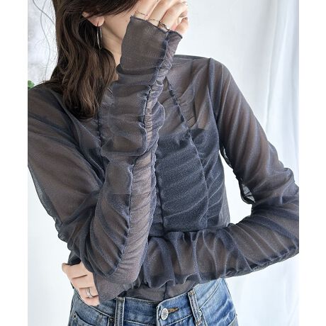 トレンドのチュール素材を採用し、全体にギャザーをあしらった華やかなトップスです。
