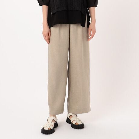 麻のようなナチュラルな風合いなのに、洗えて、しわになりにくいお役立ちワイドパンツです。