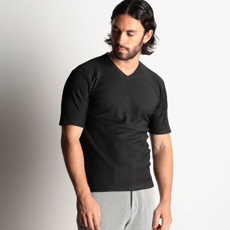 ピッチ変化のあるタック編みの凹凸と質感の違う2種類のポリエステル糸でバイアスボーダーを表現しました。原着ブライト糸の光沢がアクセントとして効いています。