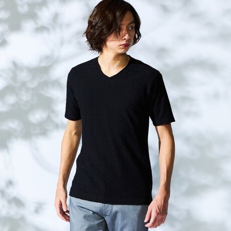オリジナル幾何学柄ジャカード生地を使用した浅めのVネックプルオーバーになります。