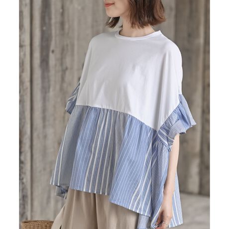 身頃は着心地の良いカットソー、袖と胸から下は布帛地で切り替えた異素材トップス。